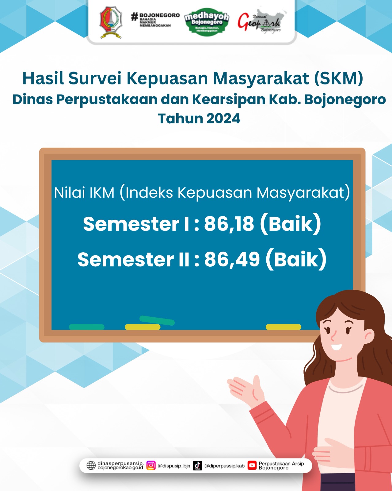 Hasil Survei Kepuasan Masyarakat (SKM) Semester I dan Semester II Tahun 2024 pada layanan Dinas Perpustakaan dan Kearsipan Kabupaten Bojonegoro telah dilaksanakan dan mendapatkan nilai Indeks Kepuasan Masyarakat (IKM) dengan kategori Baik. Nilai IKM ini menunjukkan kinerja pelayanan yang kami berikan kepada masyarakat.