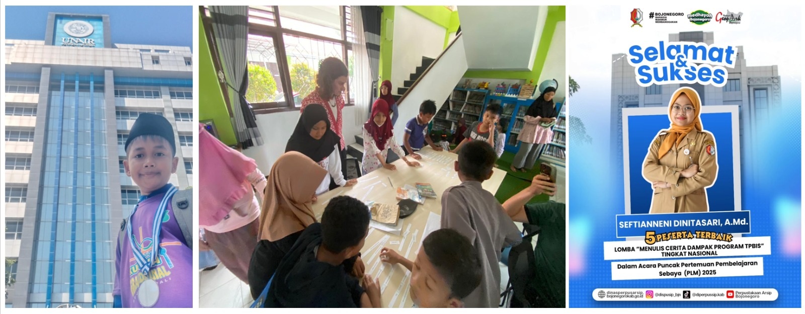 Dinas Perpustakaan dan Kearsipan Kabupaten Bojonegoro kembali meraih prestasi Nasional melalui salah satu perwakilannya yakni Seftianneni Dinitasari (Pustakawan Dispusip Bojonegoro) yang berhasil masuk 5 Besar Penulis Terbaik pada "Lomba Menulis Cerita Dampak Program TPBIS 2025" PPUK Perpustakaan Nasional RI. Karyanya menyoroti keberhasilan Transformasi Perpustakaan Berbasis Inklusi Sosial (TPBIS), yang selama ini diwujudkan Dispusip Bojonegoro lewat program-program pelatihan gratis seperti Bahasa Jepang, Bahasa Inggris, CorelDRAW, Digital Marketing, Jurnalistik, hingga Seni Pantomim, bekerja sama dengan para relawan termasuk Miss Lucy, relawan bidang budaya dan bahasa asal Amerika Serikat.
