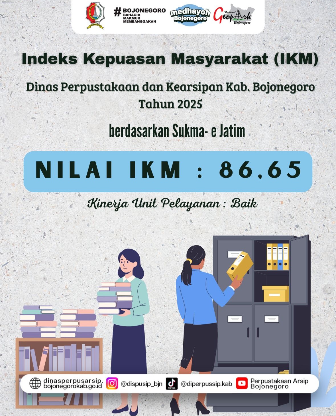 Dinas Perpustakaan dan Kearsipan Kabupaten Bojonegoro telah melaksanakan Survei Kepuasan Masyarakat tahun 2025 khususnya pada layanan perpustakaan dan layanan kearsipan dengan capaian nilai 86,65 (Baik) dan jumlah partisipan sebanyak 1.113 responden.